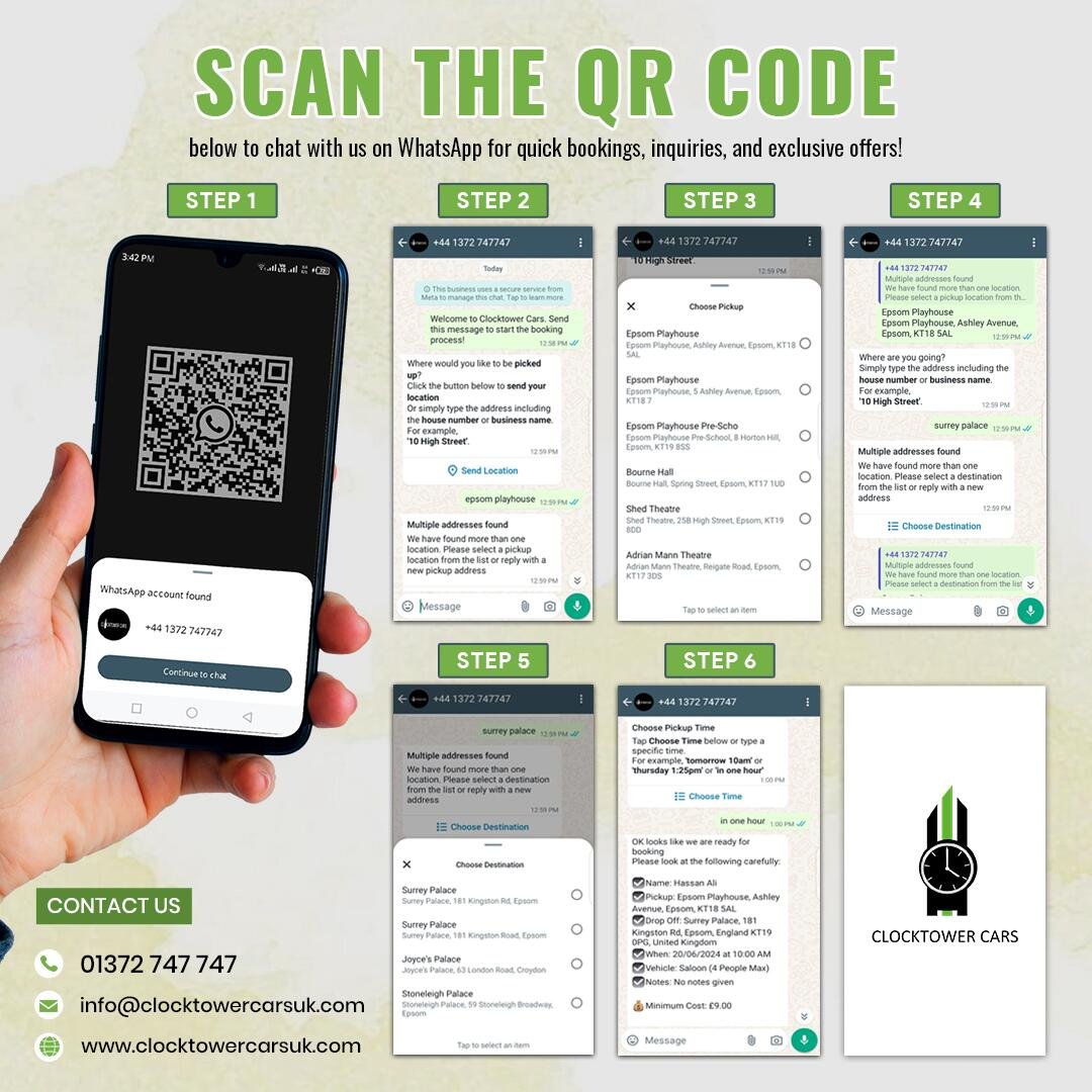 Today, make a reservation by calling us at ClockTower Cars! Reach out via WhatsApp, Book your ride from our website or utilize our Mobile application for easy and prompt bookings. Experience current travel convenience because besides serving Epsom and most airports in London.