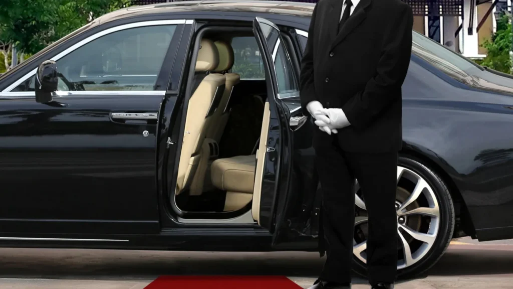- Chauffeur in dark suit, crisp shirt, and polished shoes